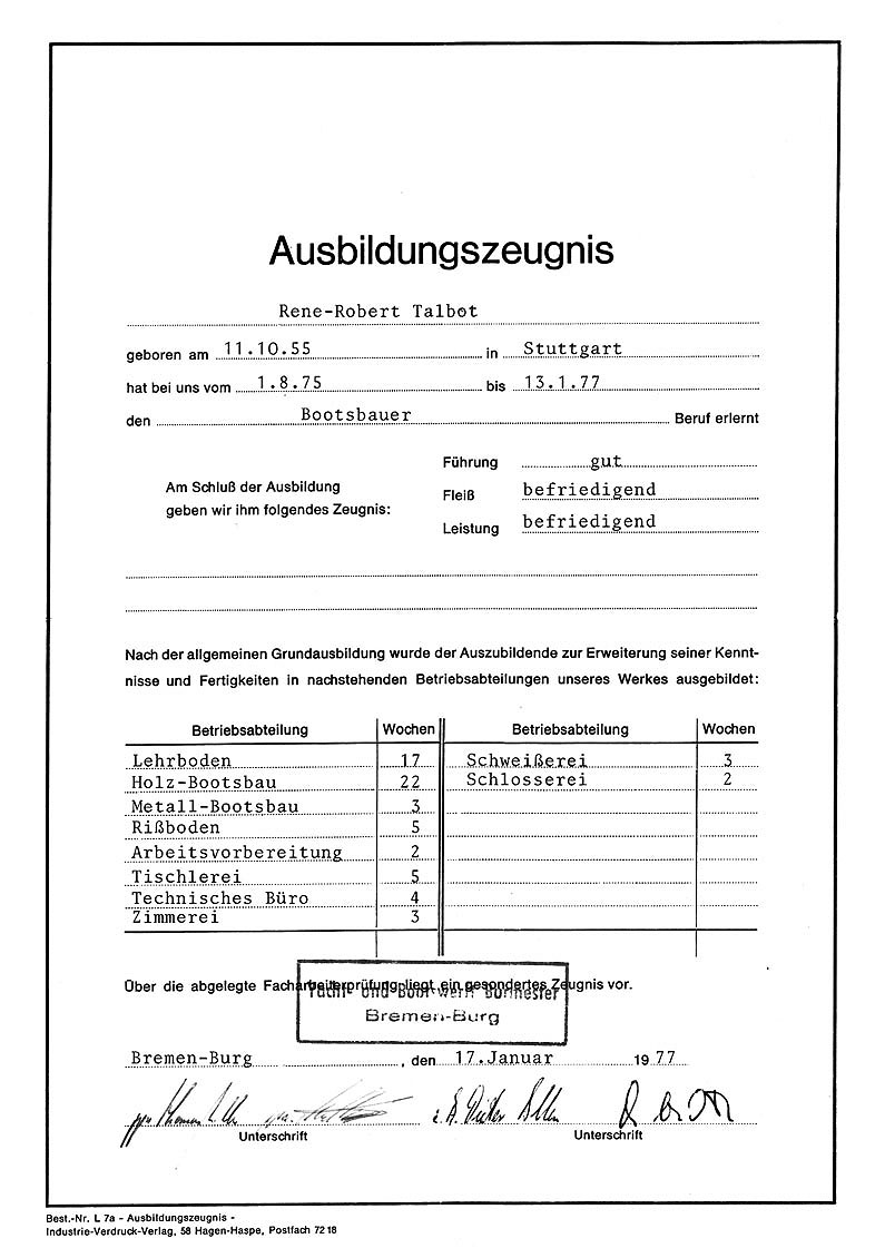 1975 Ich habe nach dem Abitur eine Segelfreizeit in den Niederlanden beim evangelischen Jugendwerk organisiert, bevor ich in diesem besonders heißen Sommer die Ausbildung (Lehre) zum Bootsbauer bei Burmester in Bremen begann; Ausbilder  war F. Ü.. Vielleicht war es auch die Zeit, dass es politisch opportun war, „in die Betriebe“ zu gehen, Joschka Fischer ist das bekannteste Beispiel dafür, wie er damals bei Opel zu arbeiten angefangen hatte. Unabhängig von allem anderen war es mein Wunsch, einerseits ein vielfältiges Handwerk zu lernen, mit dem ich später auch weltweit Segeln verbinden konnte, wie auch die Welt statt aus einer Akademischen Perspektive aus der Sicht der „Werktätigen“ zu erfahren.