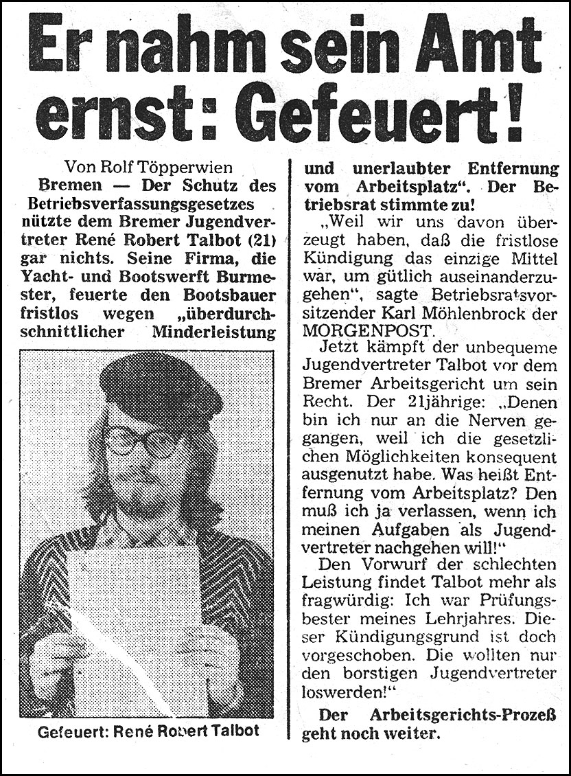 1977 Zusammen mit der wegen des Abiturs von vornherein auf zwei Jahre verkürzten Ausbildungszeit konnte ich nach 1,5 Jahren als Gesamtprüfungsbester die Ausbildung zum Facharbeiter abschließen (Ausbildungszeignis). Das Kalkül der Geschäftsleitung mich danach los werden zu können, ging fehl, denn ich musste als Jugendvertreter übernommen werden. Ich zog zum Abschluss der Lehre in die sich neu gründende 7 ner Wohngemeinschaft im Haus der Naturfreundejugend in der Buchtstr. Am 6.5. sollte eine Jugendversammlung fortgesetzt werden. Die Geschäftsleitung wollte sie zusammen mit dem Meister abbrechen, sie „sei Illegal“. Aber die jugendlichen Kollegen waren solidarisch und blieben sitzen, als ich erklärte die Versammlung wird fortgesetzt, weil alle gehört hatten, dass die Fortsetzung abgesprochen worden war und ich darauf als Versammlungsleiter den Meister und die Geschäftsleitung aufforderte, den Raum zu verlassen – was die dann auch taten. Alles in Gedächtnisprotokollen hier dokumentiert. Nach dem Wochenende wurde ich am 11.5. denn mit der lächerlicher Begründung „wegen überdurchschnittlicher Minderleistung“ gekündigt, wo ich doch sowieso nur den niedrigst möglichen Tarif-Lohn erhielt. Alles in Gedächtnisprotokollen hier dokumentiert. Und der Vorwurf der „unerlaubten Entfernungen vom Arbeitsplatz“ war genauso lächerlich, weil die selbstverständlich alle durch meine Tätigkeit als Jugendvertreter gut begründet waren (siehe hier, wie sich das alles abgespielt hat). Im Prozess auf Wiedereinstellung wurde ich von einen IGM Anwalt vertreten und die Geschäftsleitung wollte durch 2 weitere nachgeschobene Kündigungen die erste Schrottkündigung noch irgendwie retten. Hier und hier sind die Schriftsätze meines IGM-Anwalts zu lesen. Im Prozess konnte als erster Erfolg erstritten werden, dass ich für Jungendvertretertätigkeit wieder auf den Betrieb durfte, ansonsten konnte ich mein Recht auf Faulheit genießen 🙂 Mein Prozess wurde dadurch unterstützt, dass der IGM Anwalt der Bremer Morgenpost einen Tipp gab, über meinen Prozess zu berichten. Der Titel des Berichts: Er nahm sein Amt erst – gefeuert! Alle Kollegen im Betrieb lasen den selbstverständlich. Er warf ein sehr schlechtes Licht auf den Betriebsratsvorsitzenden, der sich wie eine hörige Hofschranze der Betriebsführung verhalten hatte. Mein Vergleichsvorschlag wurde von der Richterin nur geringfügig gekürzt unternommen und deren Urteil zu meinen Gunsten vorhersehbar. So konnte ich am 4.11. diesen Vergleich als Sieg mit einem Flugblatt feiern, dass ich mit einem Freund zusammen vor dem Eingang der Werft an die ganze Belegschaft verteilte, siehe hier. Insgesamt war mein Vorschlag einer Vergleichssumme sicher die richtige Entscheidung, denn die Werft wurde keine 2 Jahre danach an Lürssen verkauft und ich wäre garantiert nicht übernommen worden. Sie deckt sich mit meiner damals publizierten Analyse „Recht auf Lohn statt Recht auf Arbeit.“ Mit dem Arbeitslosengeld und der Abfindung malte ich mir schon eine 10 jährige Lohnsarbeitsfreie Zeit aus, nur ehrenamtlich engagiert mit Aktivitäten bei der Naturfreundejugend für ein Zentrum für arbeitslose Jugendlichen in Bremen Nord, siehe mein Bericht in Kein Bremen ohne Buchte, Agitprop für das Russell Tribunal gegen Berufsverbote und Vertretung von Nordmark im Bundesjugendausschuss. Dort hatte ich auch Dieter Bott kennen gelernt, mit dem mich bis heute eine enge Freundschaft verbindet – z.B. hatte er in dem steifen Gremium einen Raubdruck vonSchweine mit Flügeln verteilt. Wir waren immer hoffnungslos den SDAJ /DKP verbundenen anderen Landesverbänden unterlegen, genossen eigentlich vor allem, uns dabei zu treffen, denn die anderen wollten keine Anti-Autoritären sein. Hier ist erklärt, wie ich die Abfindung dafür verwendet habe, die Vulkan Aktionärsversammlung zu ärgern. Fritz Bettelhäuser berichtete mir, wie die Kollegen im Betriebsrat verwundert zur Kenntnis genommen hätten, dass auf einmal die Aktionäre bei der Versammlung vorher durchleuchtet und deren Sachen durchsucht wurden. Aus dieser Zeit bleib mir die Freundschaft mit Fritz Bettelhäuser, dem damaligen Betriebsratsvorsitzenden des Bremer Vulkan (er besuchte mich sogar in der Geschlossenen!), aber insbesondere mit Ernst-Werner Arendt, dem Vorsitzenden der Jugendvertretung beim Bremer Vulkan, siehe auch dessen Bericht von 1995, als er Schiffsführer der White Eagle während des Hurrikan Luis war.