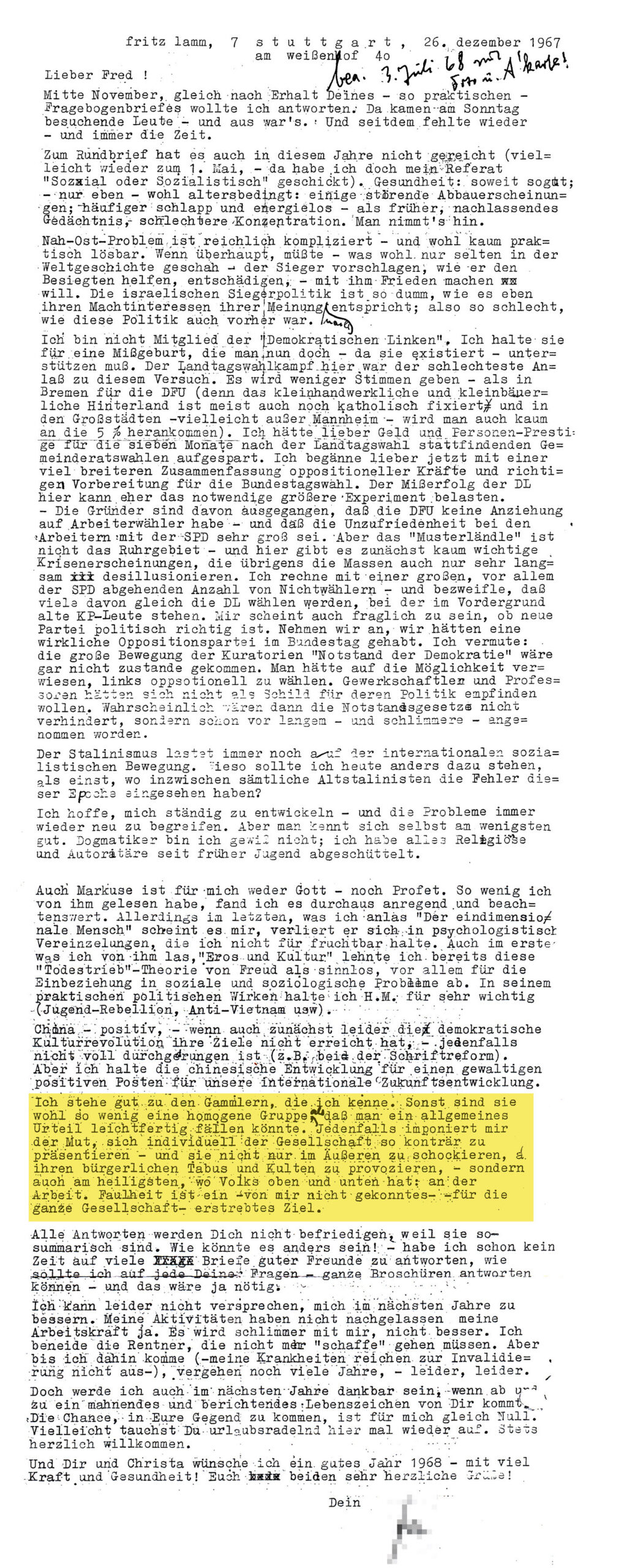 Fritz war 9 Jahre früher als Tom geboren worden. 1968 wurde im Zuge von „Phantasie an die Macht“ Lafargues nahezu verschollenes und eher lächerlich gemachtes „Recht auf Faulheit“ wieder zum Thema. Gegen die Nötigung zu arbeiten bezog Fritz 1967 in einem Brief für die Faulheit Stellung, Zitat: