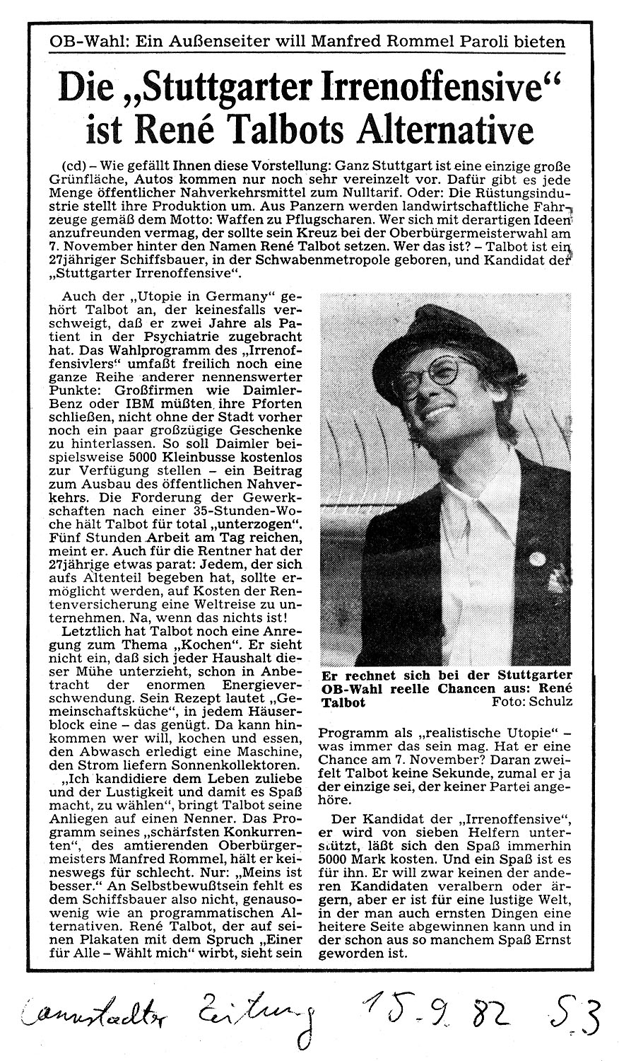 Im Sommer war ich in Bremen, machte die 3. Ausgabe des Ellener Bote alleine und bewarb mich mit der „Molly“ als Wahlprogramm für die Wahl zum Stuttgarter Oberbürgermeister. Es gab drei Zeitungsberichte, hier, hier und hier sogar in der Bild. Die darin vorgeschlagene defensiven Verteidigungsstrategie ist Peter Grohmann bis heute in Erinnerung geblieben, siehe hier. Ende meiner Anstellung im SZ, Nachfolger ist Otto Alder. Die Oberbürgermeister Wahl verliere ich mit 271 Stimmen gegen Manfred Rommel. Kurz vor der Wahl verstarb mein Vater. Er hatte noch mit Schalk in den Augen mit seinem Wagen meine Wahlplakate von der Druckerei abgeholt und zu der städtischen Stelle gebracht, die sie auf deren Wahlplakattafeln verklebte. Ein knappes Jahr war ich ziemlich niedergeschlagen, aber unausweichlich hatte mein Vater mir was übrig gelassen und so konnte ich mich im nächsten Jahr …